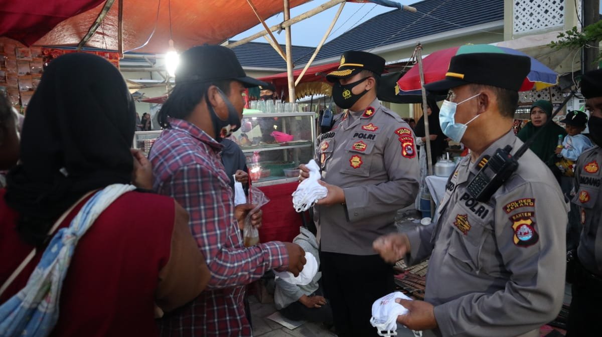 Sebanyak 2000 masker Dibagikan kepada masyarakat setempat, tampak Wakapolres Serang Kompol Didid Hermawan beserta jajarannya membagikan masker ke para masyarakat dan pedagang.