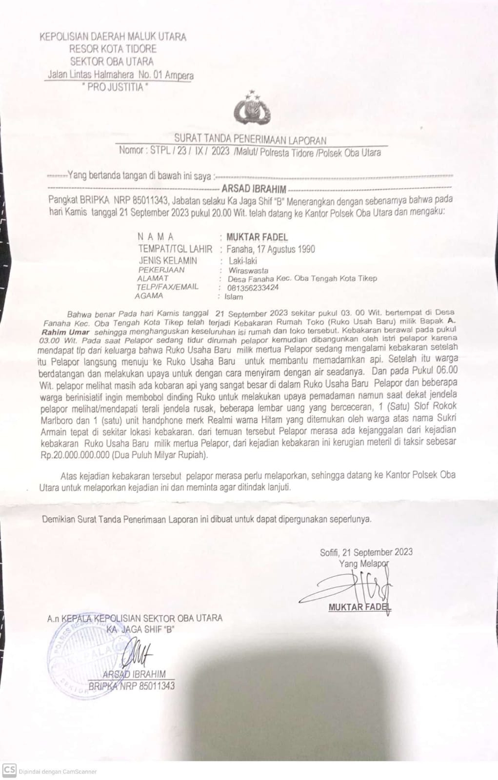 NASIONALXPOS.CO.ID,TIDORE- Proses penyelidikan yang dilakukan penyidik Polresta Kota Tidore Kepulauan terkait kasus insiden kebarkaran tokoh Usaha Baru milik Rahim Umar terletak di Desa Fannaha Kecamatan Oba Tengah dipertanyakan pihak Pelapor. Muktar Fadel.