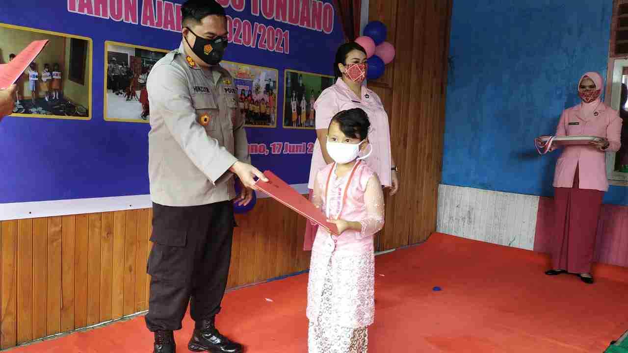 NASIONALXPOS.CO.ID, MINAHASA – Kapolres Minahasa AKBP Henzly Moningkey SIK MSi, didampingi Ketua Bhayangkari Ny Isabel Moningkey-Tanos menghadiri penamatan Taman Kanak-Kanak (TK) 03 Tondano, Angkatan 2020-2021, Kamis (17/6/2021).