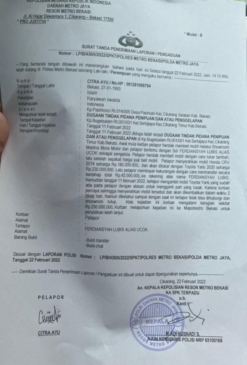 NASIONALXPOS.CO.ID, BEKASI – Diduga oknum kepala cabang (Kacab) Madina Mora Motor FL alias Ucok melakukan tindak pidana penggelapan kepada Citra Ayu, Hal itu akhirnya korban melapor ke Polres Metro Bekasi bernomer surat LP/B/430/II/2022/SPKT.