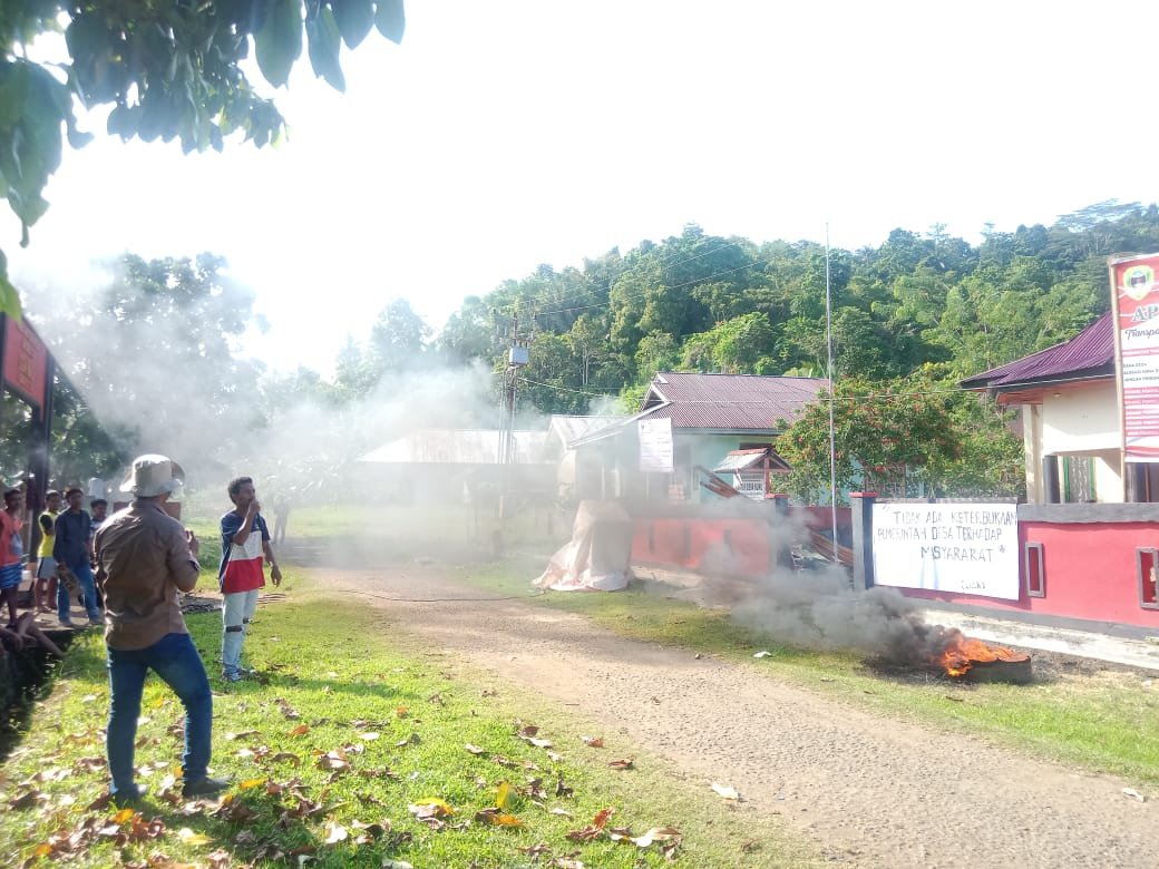 Demonstrasi yang digulirkan Elemen Mahasiswa dan Pemuda Desa Nuku, selain membakar ban bekas, dilengkapi spanduk yang dipajang di pagar Kantor Desa, bertulisan “Tidak Ada Keterbukaan Pemerintah Desa terhadap Masyarakat,