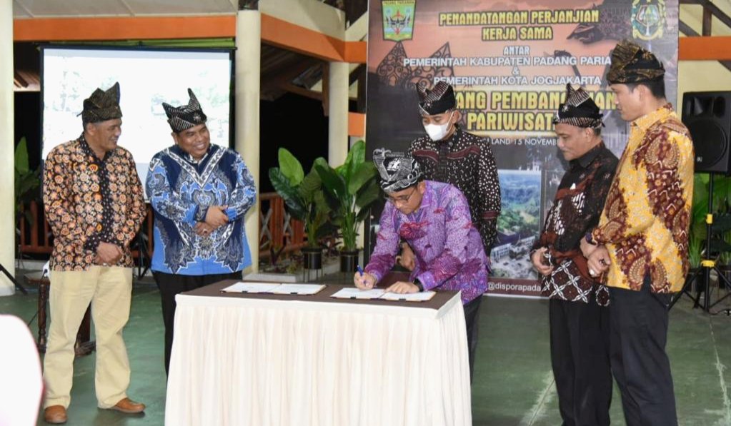 NASIONALXPOS.CO.ID, SUMBAR – Disaksikan Bupati Padang Pariaman Suhatri Bur dan Pj Walikota Yogyakarta Sumadi, Ketua DPRD Padang Pariaman Ir H Arwinsyah MT dan Sekretaris Daerah Kabupaten Padang Pariaman Rudy R Rilis, Kepala Dinas Pariwisata Pemuda dan Olahraga Padang Pariaman Muhammad Fadhly dan Kepala Dinas Pariwisata Kota Yogyakarta Wahyu Hendratmoko menandatangani Perjanjian Kerjasama tentang pengembangan kepariwisataan. Hal ini sebagai tindaklanjut dari Kesepakatann Bersama kedua daerah yang telah dilakukan sebelumnya antar pemerintahan daerah.