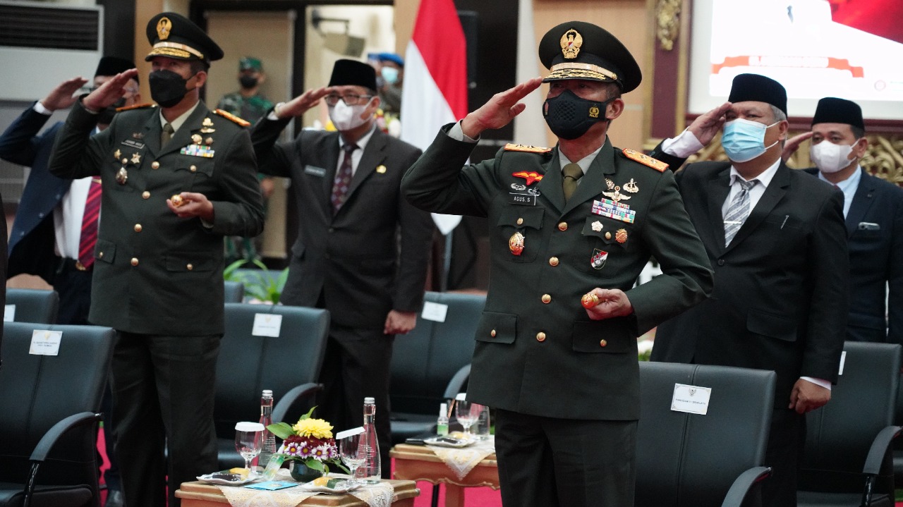NASIONALXPOS.CO.ID, PALEMBANG – Panglima Kodam (Pangdam) II/Sriwijaya Mayjen TNI Agus Suhardi dan Forum Komunikasi Pimpinan Daerah (Forkopimda) Provinsi Sumsel, mengikuti upacara peringatan Hari Kesaktian Pancasila tanggal 1 Oktober 2021 secara virtual, di Ruang Auditorium Bina Praja Pemprov Sumsel Jalan Kapten A Riva’i Kelurahan Sei Pangeran Kecamatan Ilir Timur I Kota Palembang, Jum’at (1/10/2021).