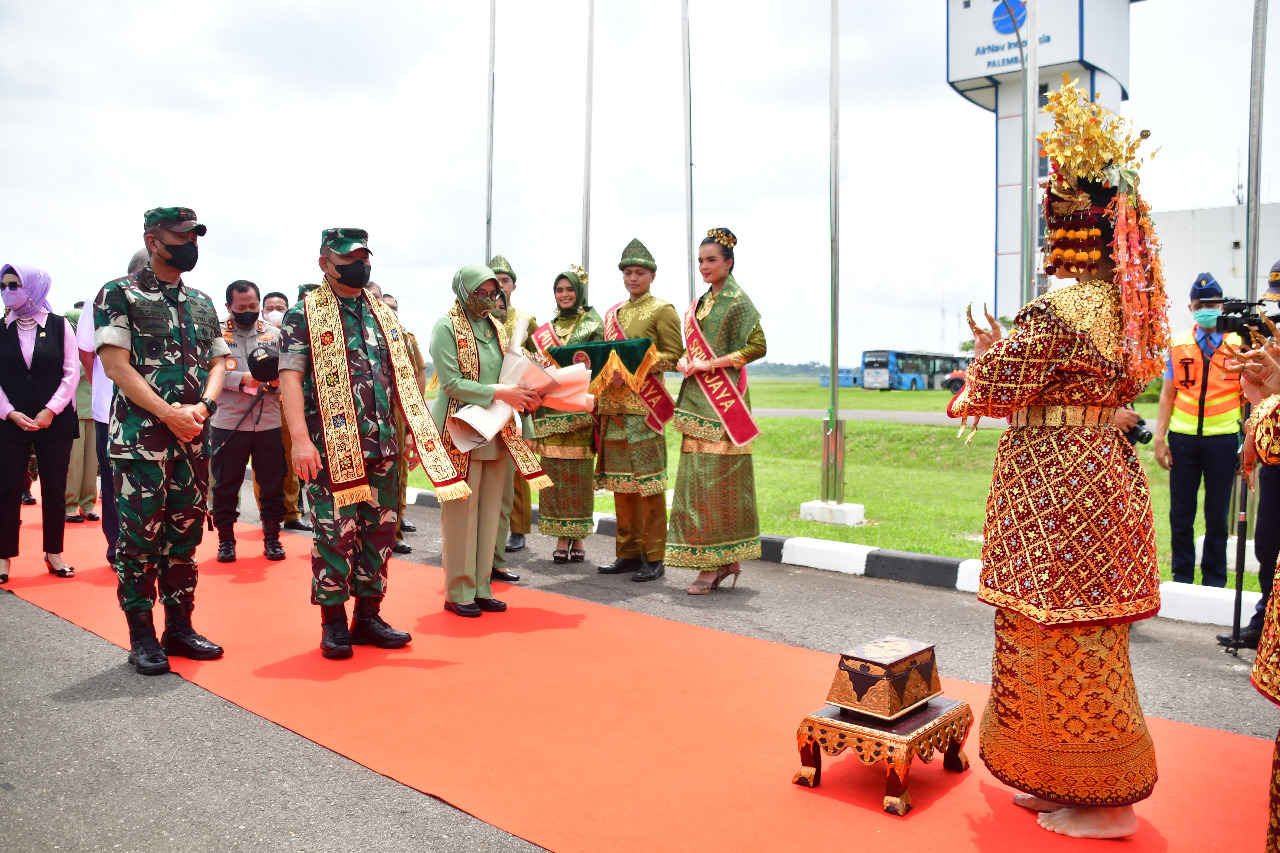 Kedatangan Jenderal TNI Dudung Abdurachman dan Istri, juga disambut dengan Pengalungan Selempang dan Handbucked oleh Bujang-Gadis Palembang serta Tari Gending Sriwijaya Tarian Khas Provinsi Sumatera Selatan sebagai prosesi penyambutan adat.