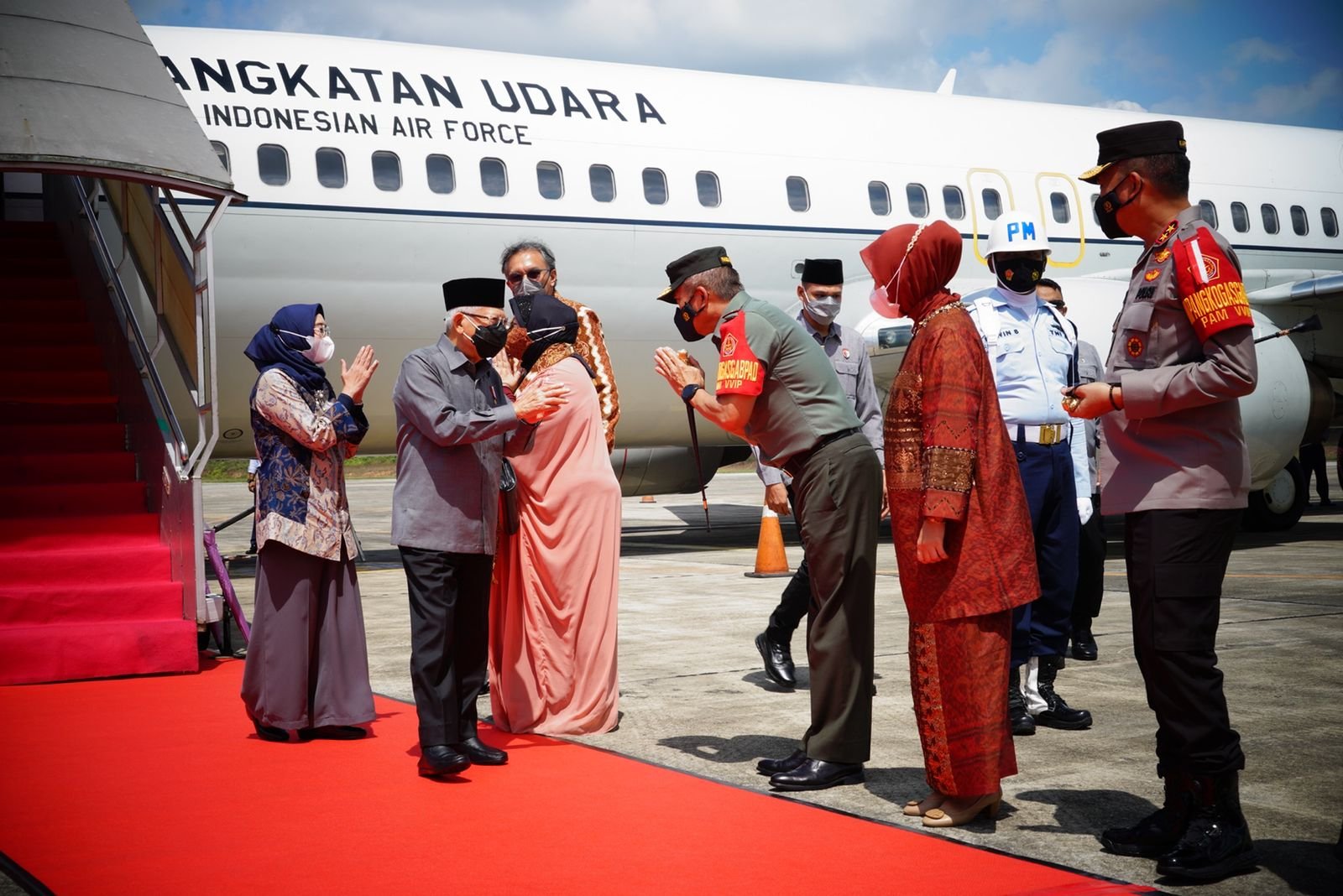 NASIONALXPOS.CO.ID, PALEMBANG – Pangdam II/Sriwijaya Mayjen TNI Agus Suhardi bersama Forkopimda Provinsi Kepulauan Bangka-Balitung (Babel) menyambut kunjungan Wakil Presiden (Wapres) RI KH. Ma’ruf Amin dan Ibu Hj. Wury Ma’ruf Amin beserta rombongan, di Bandara Depati Amir Provinsi Kepulauan Babel, Selasa (14/6/2022).