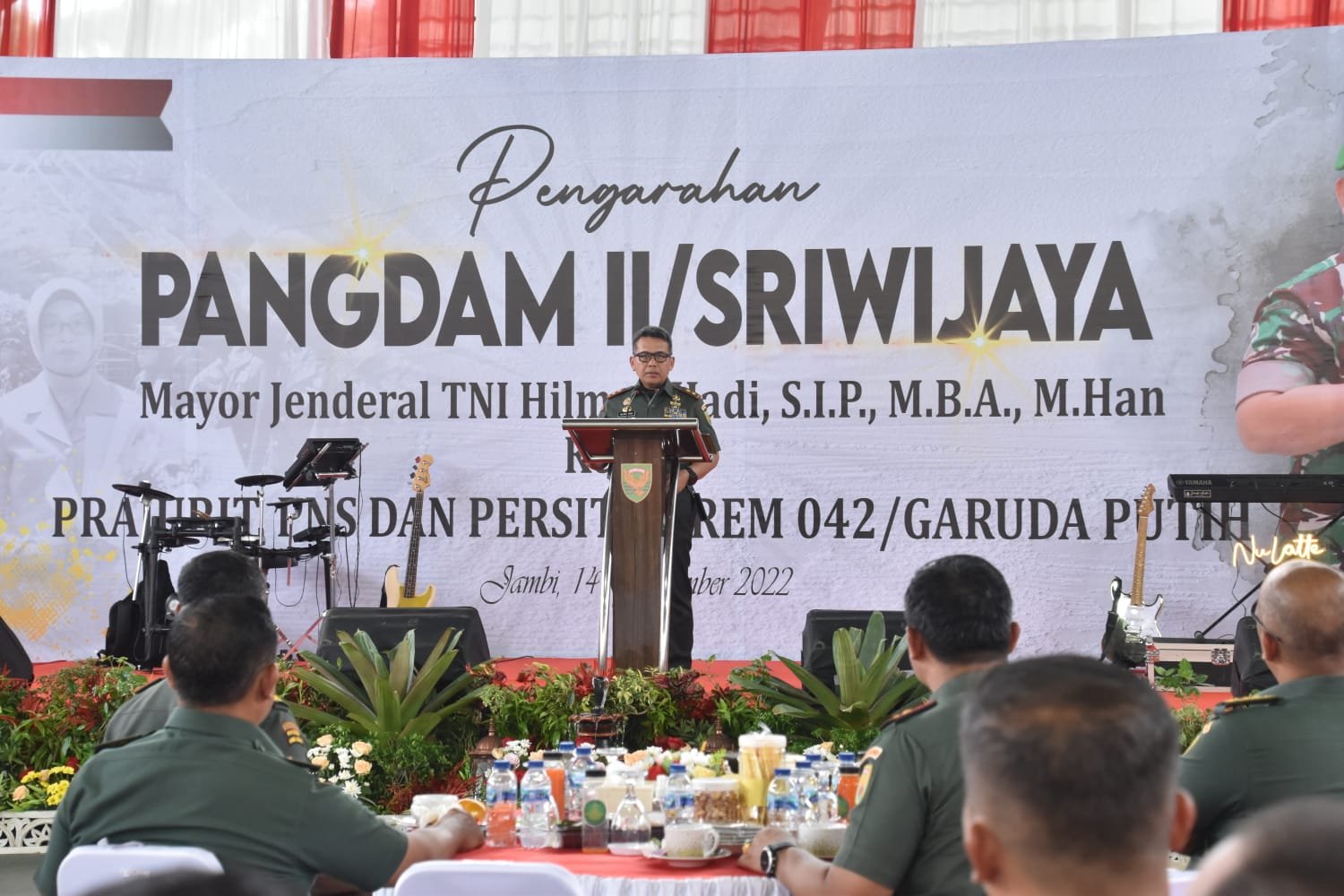 NASIONALXPOS.CO.ID, JAMBI – Panglima Kodam II/Sriwijaya Mayjen TNI Hilman Hadi, S.I.P M.B.A M.Han, didampingi Ketua Persit Kartika Chandra Kirana Pengurus Daerah II/Swj Ny. Hesti Hilman Hadi, memberikan pengarahan kepada seluruh Prajurit, PNS dan Persit Korem 042/Gapu Provinsi Jambi, Rabu (14/9/2022).