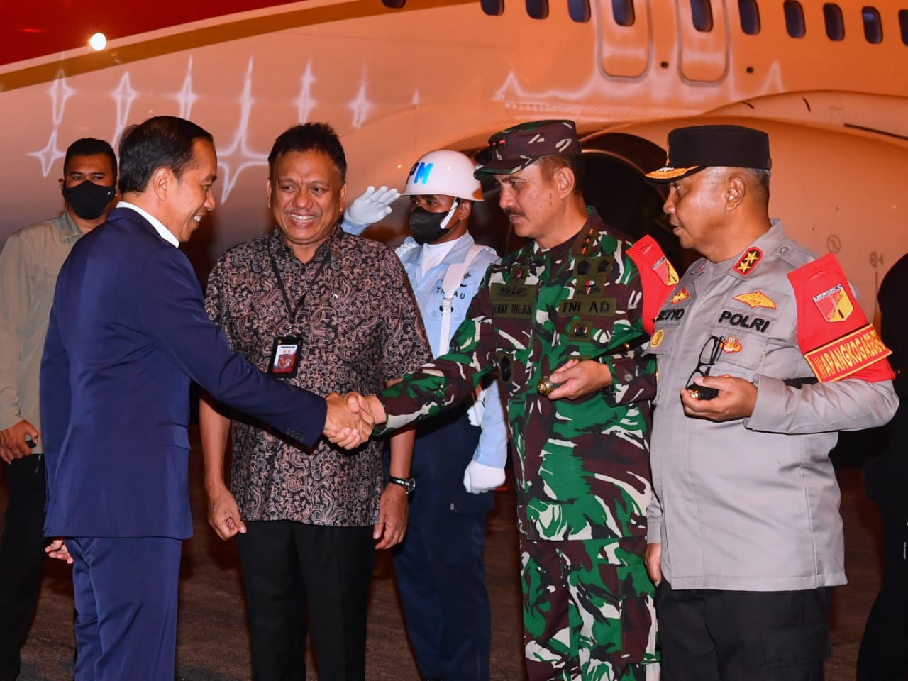 NASIONALXPOS.CO.ID,MANADO,-Panglima Kodam XIII/Merdeka Mayjen TNI Alfred Denny Tuejeh selaku Panglima Kogasgab Pam VVIP, beserta unsur Forkopimda Provinsi Sulut menyambut kedatangan Presiden RI, Ir. H. Joko Widodo bersama rombongan di Bandara Samratulangi Manado, Sulawesi Utara, Rabu (18/1/2023).