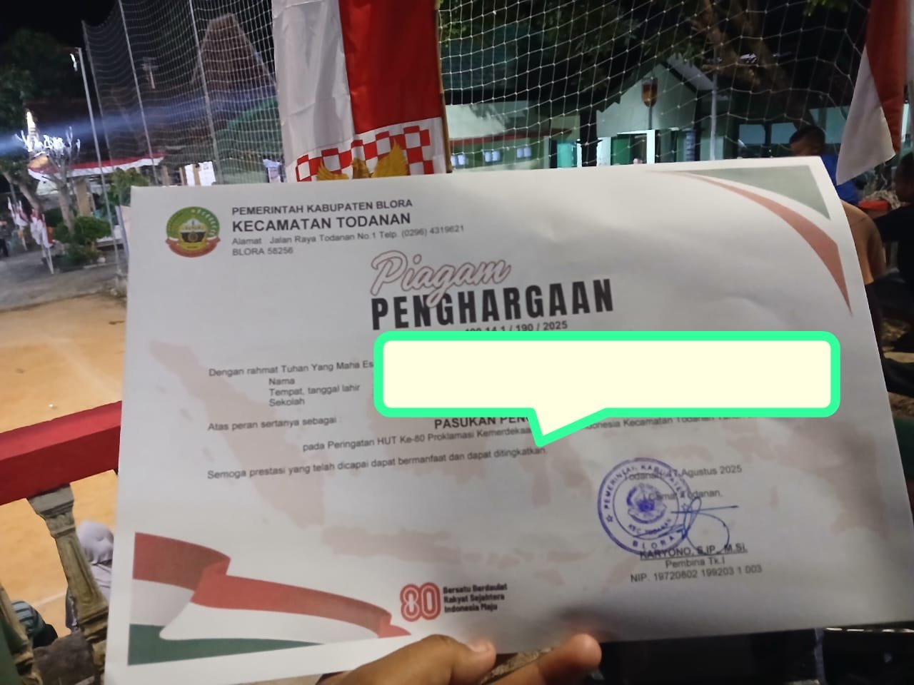 Foto piagam penghargaan yang diberikan kepada salah seorang anggota Paskibraka Kecamatan Todanan, Blora