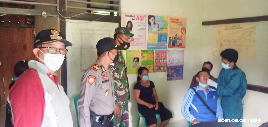 NASIONALXPOS.CO.ID, SINTANG KALBAR – Babinsa Koramil 02/Serawai kawal jalannya kegiatan Swab Antigen kepada masyarakat di Desa Baras Babun, Kecamatan Serawai, Sintang yang dilaksanakan oleh Puskesmas Serawai, pada Minggu pagi (06/06/2021).
