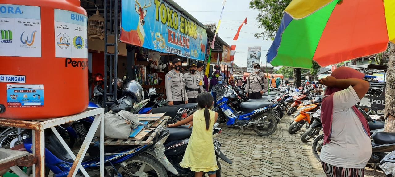 Untuk itu, Polsek Banjarejo Polres Blora intensif menggelar patroli imbauan protokol kesehatan. Satu regu patroli Polsek Banjarejo yang dipimpin oleh Kapolsek Iptu Sumaryono,SH,MH menyambangi pasar tradisional Kecamatan Banjarejo.