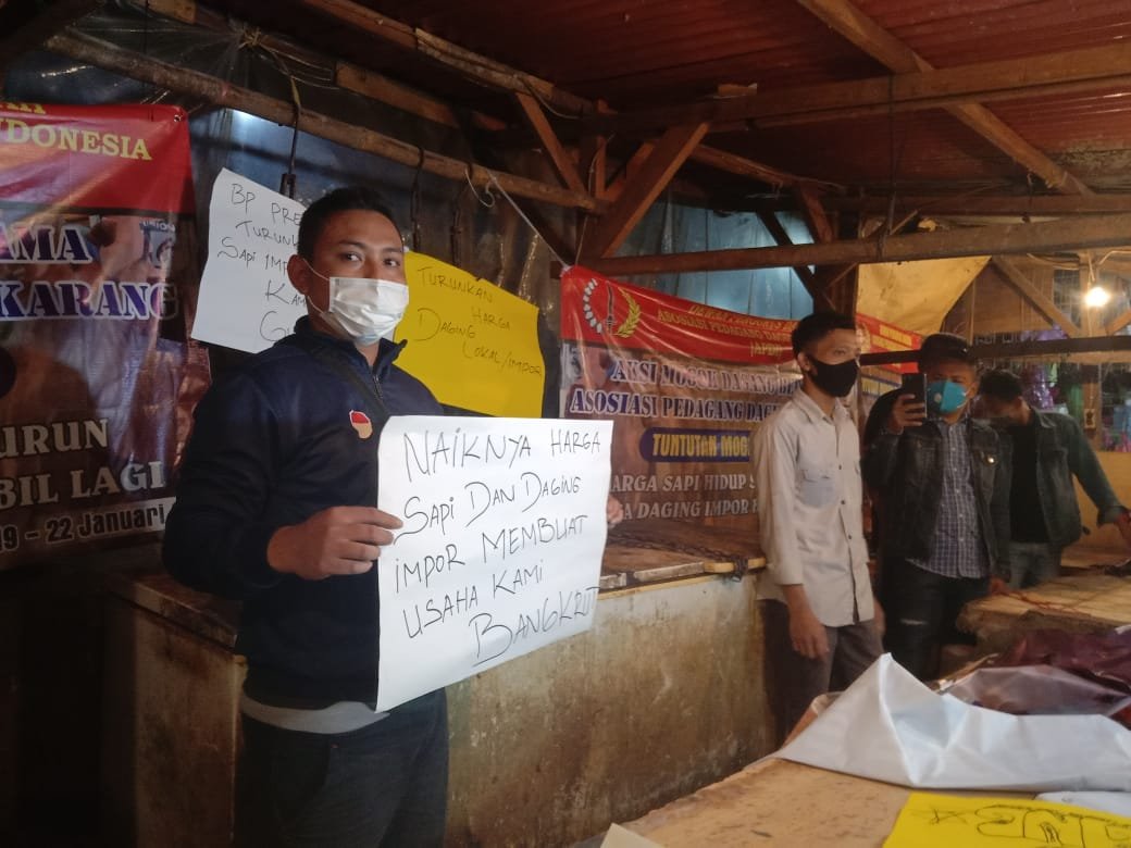 Dengan membentangkan poster di tempat usahanya para pedagang daging lokal dan impor serta pedagang ayam potong, di pasar cikarang melakukan aksi mogok berdagang selama tiga hari, setelah semakin melonjaknya harga daging lokal yang awalnya hanya 110 dari peternak, di jual mencapai 125 perkilo gramnya, selain itu harga daging impor yang awalnya hanya Rp 70 melonjak menjadi 80 perkilo gramnya, sedangkan harga ayam potong yang biasanya hanya 28 perkilo gram melonjak dari peternak mencapai 40 kilo gram perkilo gramnya.