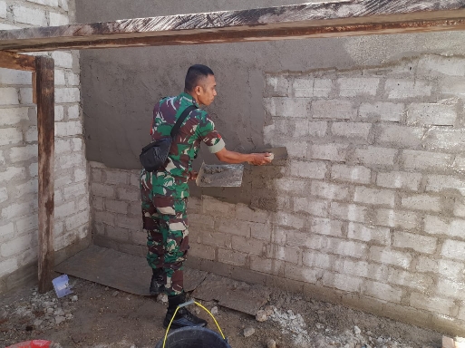 NASIONALXPOS.CO.ID,HALTENG – Praka Idrus Waly. Babinsa Koramil 1512-01/Weda, Kodim 1512/Weda Kabupaten Halmahera Tengah, gotong royong membantu plesteran rumah warga binaan, di desa Air Salobar Kecamatan Weda Selatan Kabupaten Halmahera Tengah Provinsi Maluku Utara Kamis (08/12/2022).