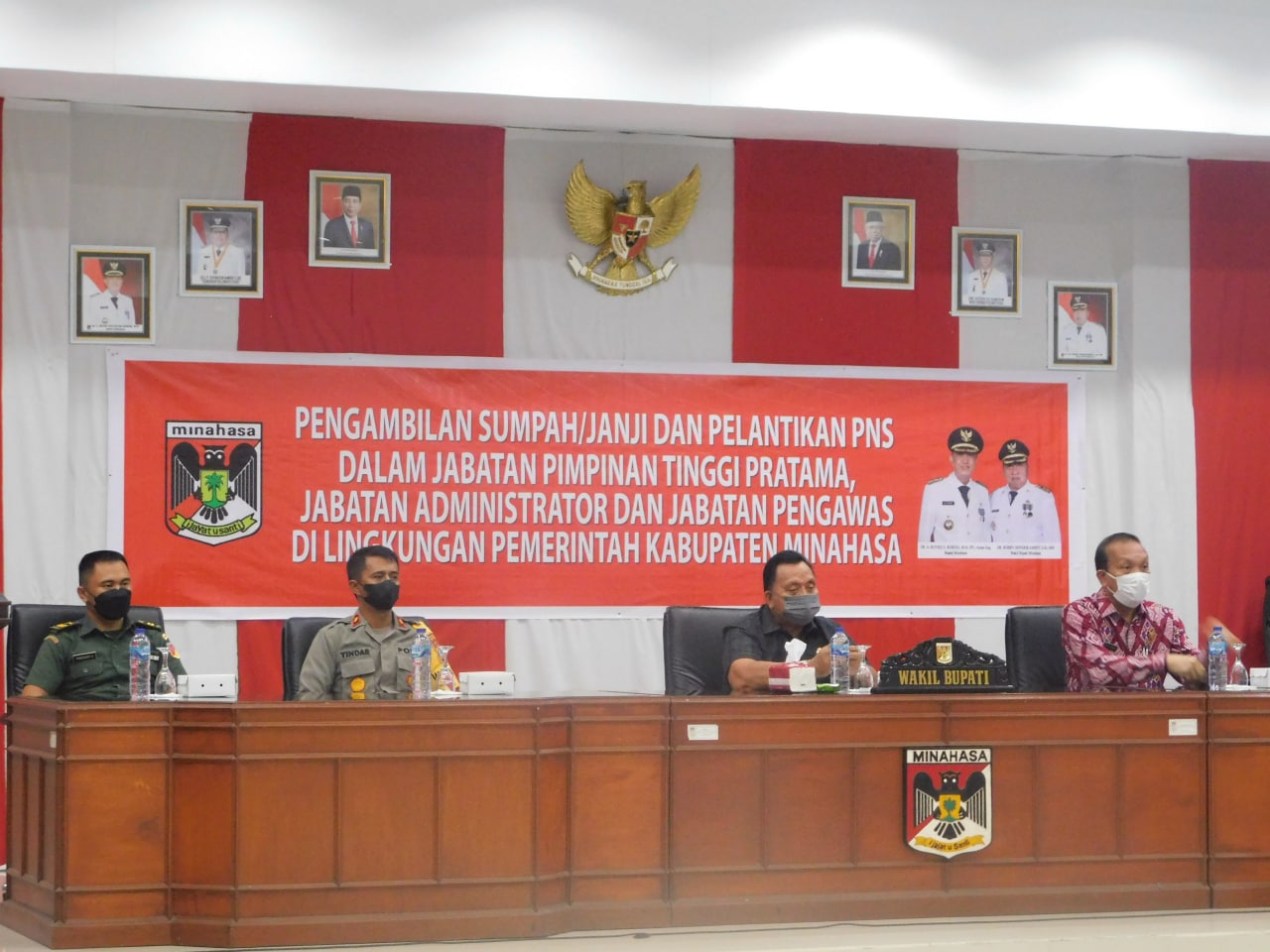 NASIONALXPOS.CO.ID.MINAHASA,- Perwira Seksi Personalia Kodim 1302/Minahasa Lettu Inf Farisnop Ompoeo mewakili Dandim menghadiri acara Pengambilan Sumpah atau Janji dan Pelantikan Pegawai Negeri Sipil dalam Jabatan Pimpinan Tinggi Pratama, Jabatan Administrator, dan Jabatan Pengawas Lingkungan Pemerintah Kabupaten Minahasa bertempat di Aula Ruang Sidang Kantor Bupati,