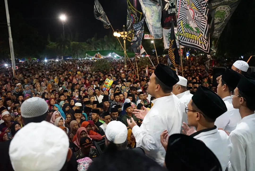 Bupati lantas bertanya dengan ribuan jamaah yang hadir, “pripun bapak ibu, remen nggih (Senang ya) haul diadakan lagi,” tanya Gus Arief.