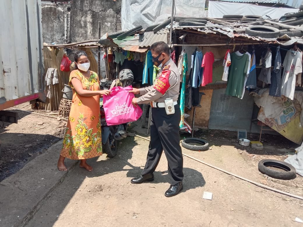 Kapolsek tambun AKP Gana Yudha bersama dengan beberapa petugas Polsek tambun menggunakan kendaraan patroli mendatangi satu persatu warga tidak mampu untuk di berikan sambako dan masker secara gratis sambil melakukan edukasi agar selalu menggunakan masker bila keluar rumah dan selalu menjaga jarak dengan warga lainnya (17/08/2020).