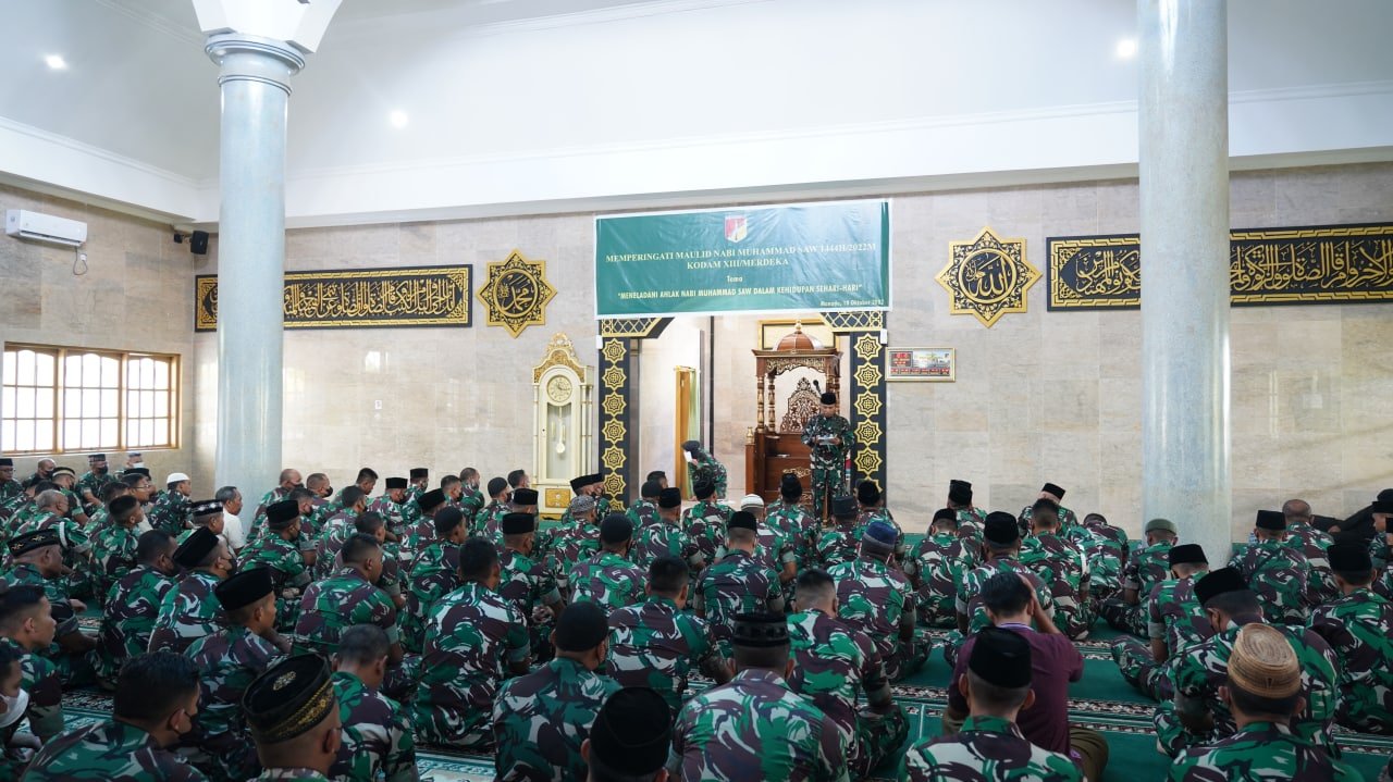 NASIONALXPOS.CO.ID,MANADO,-Dalam risalah Islam disebutkan bahwa kelahiran Nabi Muhammad SAW di muka bumi ini adalah sebagai rahmat bagi seluruh alam semesta atau Rahmatan Lil Alamin dengan membawa amanah dari Allah SWT yang tujuannya untuk keselamatan kedamaian kasih sayang dan kebahagiaan baik di dunia maupun di akhirat kelak. Hal inilah yang menjadi salah satu alasan kenapa Bulan Rabiul Awal menjadi sangat dihormati dan dimuliakan oleh Umat Islam semuanya. Demikian sambutan tertulis Pangdam XIII/Merdeka Mayjen TNI Denny Tuejeh yang dibacakan oleh Kasdam XIII/Merdeka Brigjen TNI M. Luthfie Beta, S, Sos,M.Si. dalam acara Memperingati Maulid Nabi Muhammad SAW 1444 H/2022 M, di Masjid Nurul Birri Kodam XIII/Merdeka, Selasa (18/10/2022).