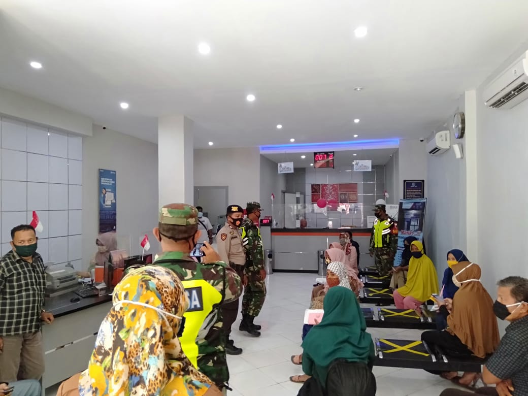 Personil Polsek Bontonompo bersama Koramil 1408/09 Bontonompo dan petugas puskesmas melakukan penegakan disiplin protokol kesehatan, Penegakan disiplin protokol kesehatan dilakulan di kantor Bank Rakyat Indonesia (BRI) unit bontonompo Kelurahan Tamallayang, kecamatan bontonompo. Selasa, (25/08/2020).