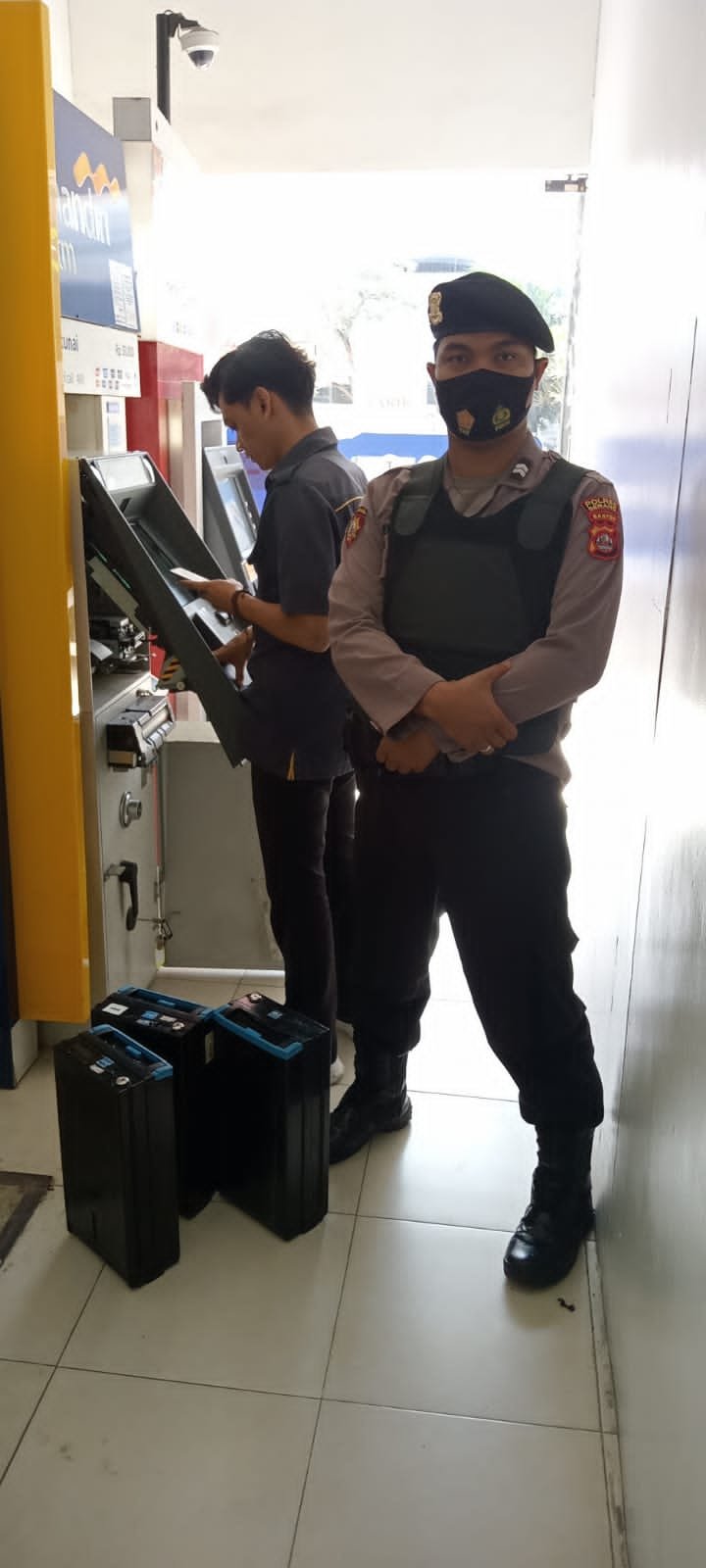 NASIONALXPOS.CO.ID, SERANG – Personel Sat Samapta Polres Serang Briptu Derli Iksyandra melaksanakan tugas pengawalan pengisian mesin Anjungan Tunai Mandiri (ATM). Senin, (04/04/2022).