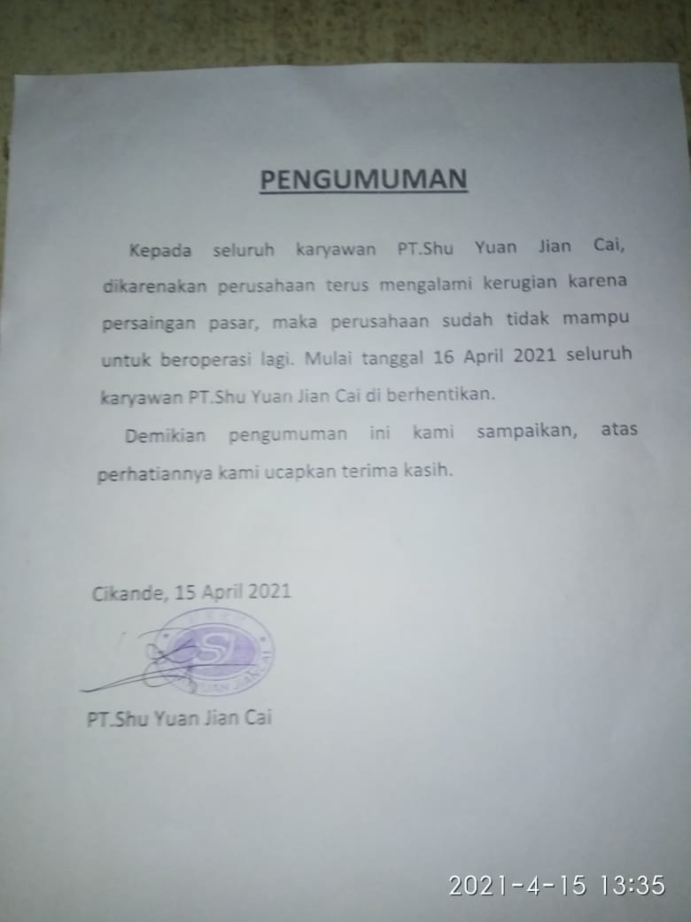 Dalam surat tersebut tertulis, kepada seluruh karyawan PT. Shu Yuan Jian Cai, dikarenakan perusahaan terus mengalami kerugian karena persaingan pasar, maka perusahaan sudah tidak mampu untuk beroperasi lagi. Maka tanggal 16 April 2021 seluruh karyawan PT. Shu Yuan Jian Cai diberhentikan. Demikian isi surat pemberitahuan kepada seluruh karyawan yang ditulis pada tanggal 15 April 2021.