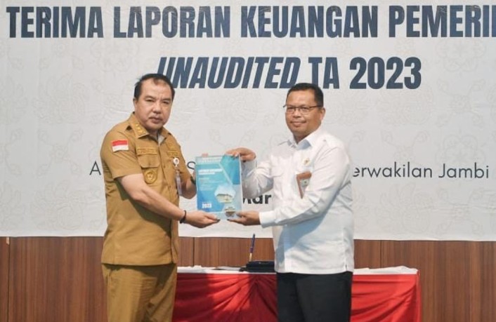 LKPD Unaudited tahun 2023 tersebut diterima Kepala BPK RI Perwakilan Provinsi Jambi Paula Henry Simatupang, yang sebelumnya didahului penandatanganan berita acara serah terima.