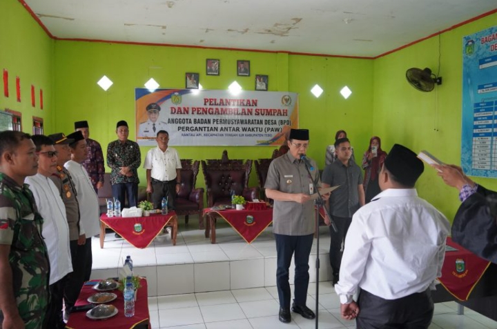 NASIONALXPOS.CO.ID, TEBO – Pj Bupati Adhi Varial lantik Fatolil M. Jalil anggota Badan Permusyawaratan Desa (BPD) pergantian antar waktu (PAW) menggantikan Zuhdi, S. Pd.I di kantor desa Rantau Api Kecamatan Tengah Ilir Kabupaten Tebo, Jum’at (30/08/24).