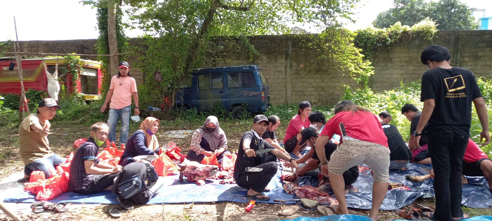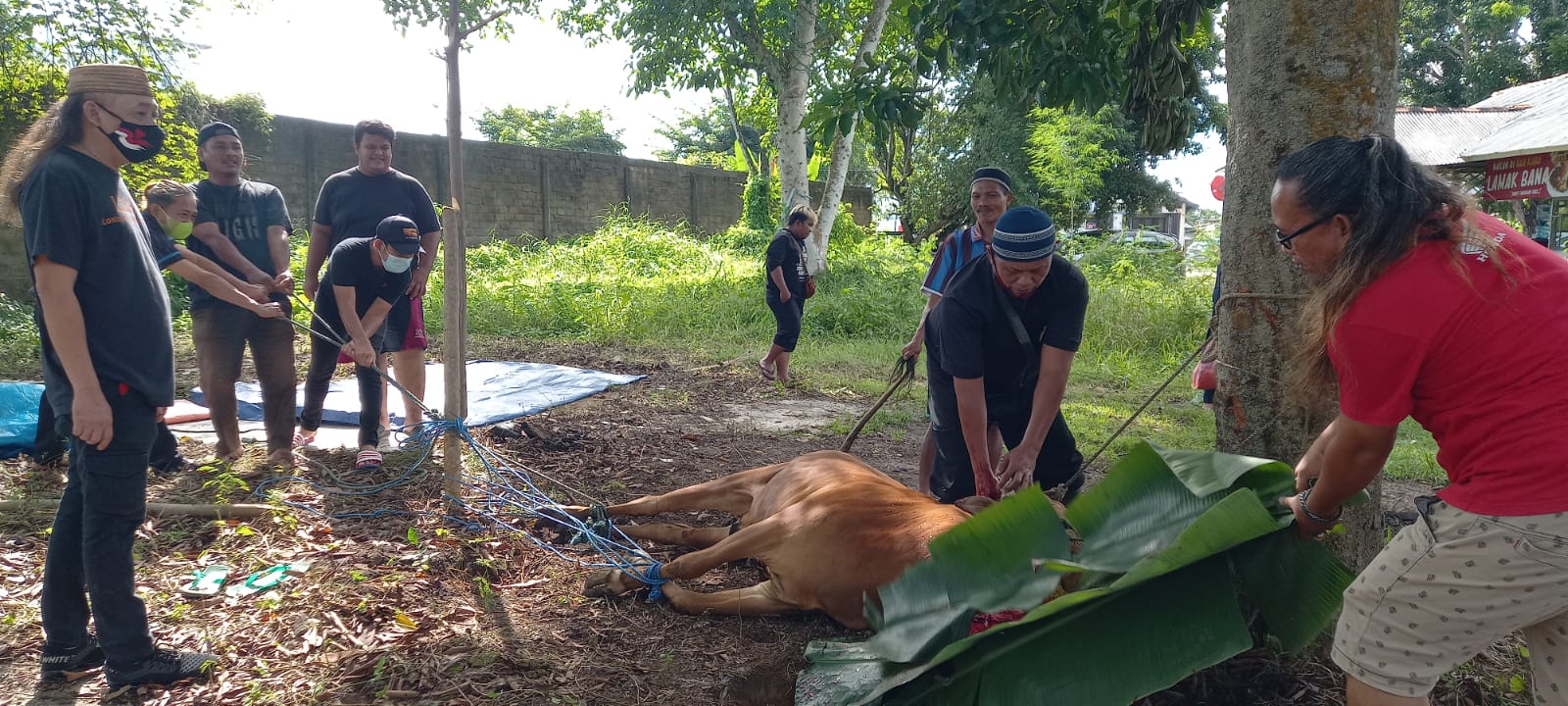 NASIONALXPOS.CO.ID, PANGKALPINANG – Kelompok kerja (Pokja) wartawan kota Pangkalpinang melakukan penyembelihan hewan kurban satu ekor Sapi dan dua ekor Kambing dalam rangka merayakan Hari raya Idul adha 1442 di halaman samping Bakueda, bukit Intan kecamatan Girimaya. Rabu (21/7/2021).