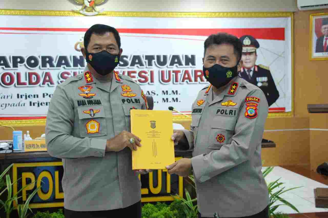 Kegiatan yang dilaksanakan dengan tetap mematuhi protokol kesehatan ini diakhiri dengan penyerahan Buku Laporan Kesatuan Polda Sulut dari Irjen Pol Nana Sudjana kepada Irjen Pol Mulyatno.