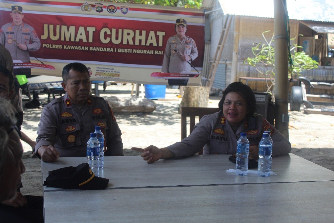 Mengawali pembicaraanya, Kapolres Kawasan Bandara I Gusti Ngurah Rai AKBP. Ida Ayu Wikarniti, mengucapkan terimakasih kepada masyarakat kelompok nelayan yang sudah meluangkan waktu menghadiri acara Jumat Curhat yang dilaksanakan oleh Polres Bandara.