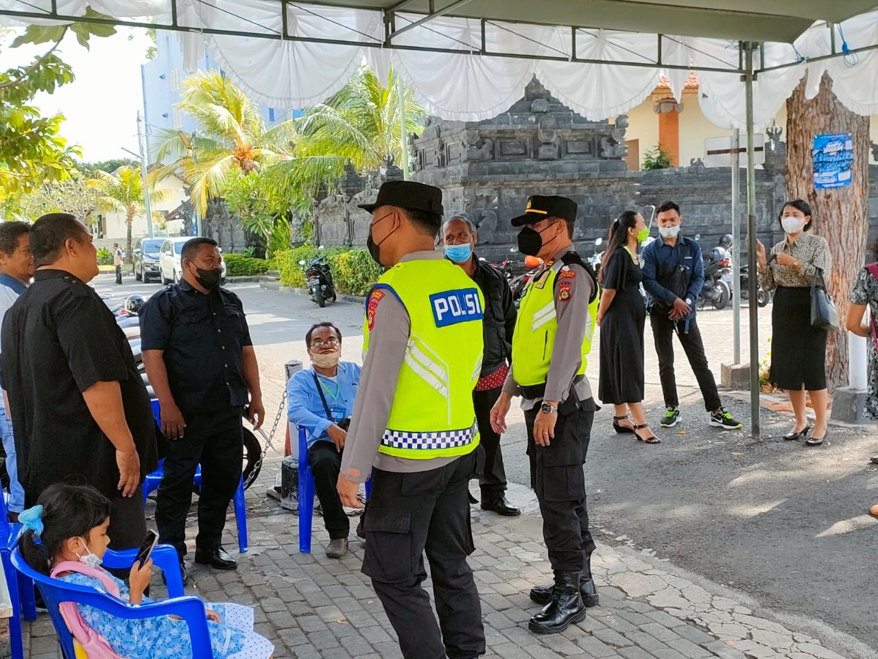NASIONALXPOS.CO.ID, BADUNG -Personil Polres Kawasan Bandara I Gusti Ngurah Rai melaksanakan pengamanan kegiatan ibadah sekaligus pengawasan protokol kesehatan di Gereja Ekklesia Bandara I Gusti Ngurah Rai. minggu, (4/9/2022).