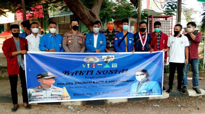 NASIONALXPOS.CO.ID, BAUBAU/SULTRA -Kepolisian Resort (Polres) Baubau bersama Komite Pemuda Nasional Indonesia (KNPI) dan Organisasi Kepemudaan (OKP) Se-Kota Baubau menggelar Aksi Nyata Berbagi Sembako kepada masyarakat Kota Baubau dengan tema Bersinergi Untuk Indonesia Bangkit, Jumat, 23 Juli 2021.