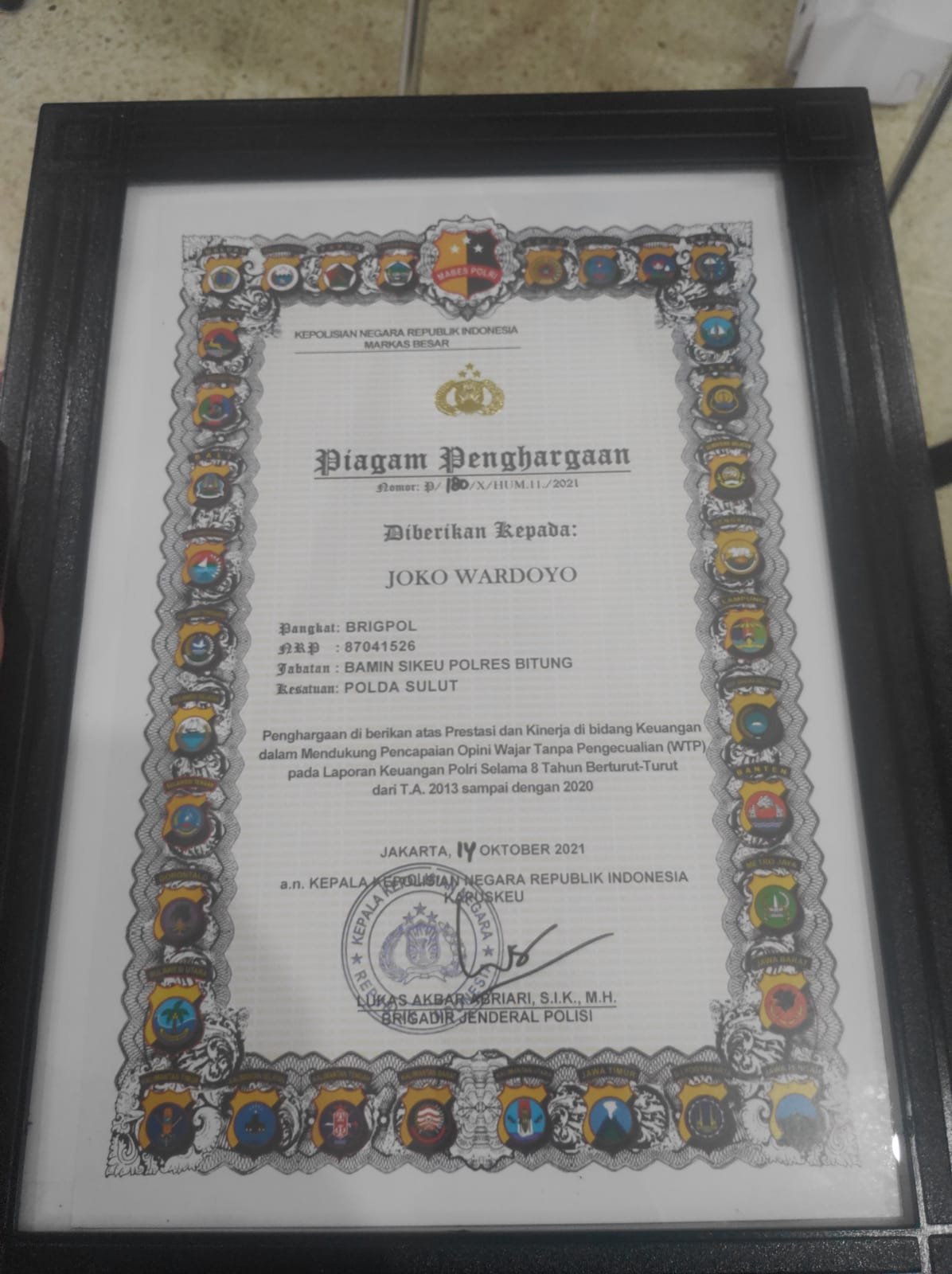Polres Bitung menerima penghargaan dari Kapolri JENDERAL (POL) Listyo Sigit Prabowo. Penghargaan tersebut diserahkan Kapolda Sulut IRJEN POL. Drs. Mulyatno kepada BRIGPOL Joko Wardoyo sebagai operator SAIBA terbaik jajaran Polda Sulut atas prestasi dan kinerja di bidang keuangan dalam mendukung pencapaian opini wajar tanpa pengecualian (WTP) pada laporan keuangan Polri selama 8 tahun berturut turut dari T.A. 2013 s/d 2020.