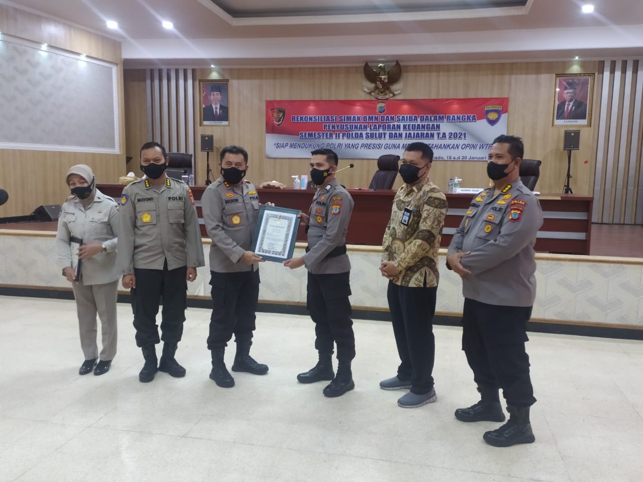 Penghargaan ini diserahkan pada kegiatan Rekonsiliasi SIMAK BMN dan SAIBA dalam Rangka Penyusunan Laporan Keuangan Semester II Polda Sulut dan jajaran Tahun Anggaran 2021 yang digelar di Aula Catur Prasetya Mapolda Sulut, Selasa (18/1/2022).