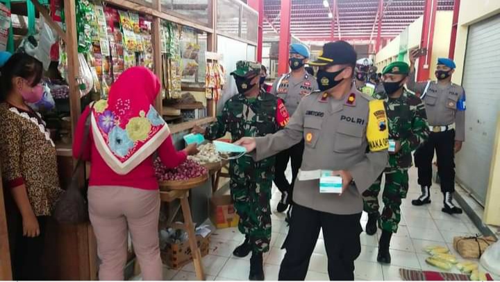 BLORA –Polres Blora Polda Jawa Tengah bersama Forum Komunikasi Pemerintah Daerah (Forkopimda) Kabupaten Blora menggelar pembagian masker gratis kepada warga di Pasar Rakyat Sido Makmur Kabupaten Blora, Kamis (10/9/2020).