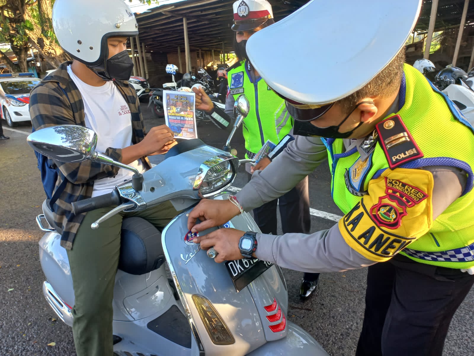 Polres Klungkung Bagikan Masker Dan Stiker Edukasi Tertib Berlalu Lintas