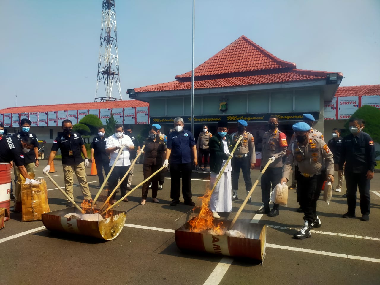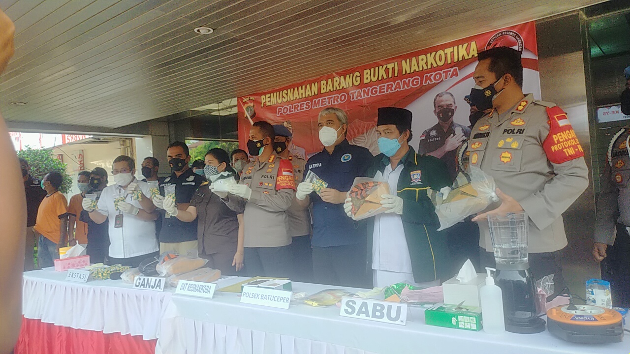 Kapolres Metro Tangerang Kota, Kombes Pol. Deonijiu De Fatima kepada awak media saat konferensi Pers di Halaman Mapolres menjelaskan, pihaknya bersama intstansi terkait dari Kejaksaan, Pengadilan Negeri dan BNN Kota Tangerang bersama-sama memusnahkan barang bukti Narkotika yang di ungkap Satresnarkoba Polres Metro Tangerang Kota dalam kurun waktu Bulan Mei sampai dengan Bulan Juli 2021.