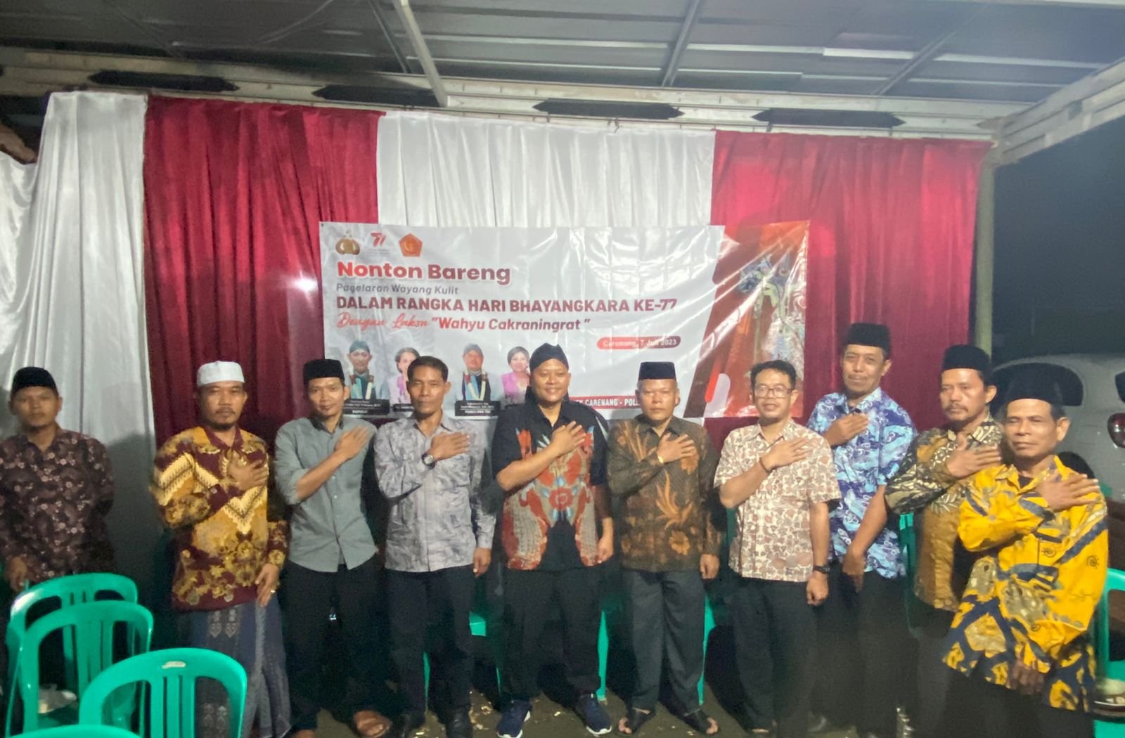 Kapolres Serang AKBP Yudha Satria, S.H., S.I.K. melalui Kapolsek Carenang Polres Serang IPTU Saeful Sani, SE mengatakan, bahwa Muspika Carenang dan Muspika Binuang bersama Para Kanit/Kasi, beserta Anggota Polsek Carenang melaksanakan giat Nonton Bareng Gelar Budaya Pagelaran wayang Kulit dengan Lakon “ Wahyu Cakraningrat ”.