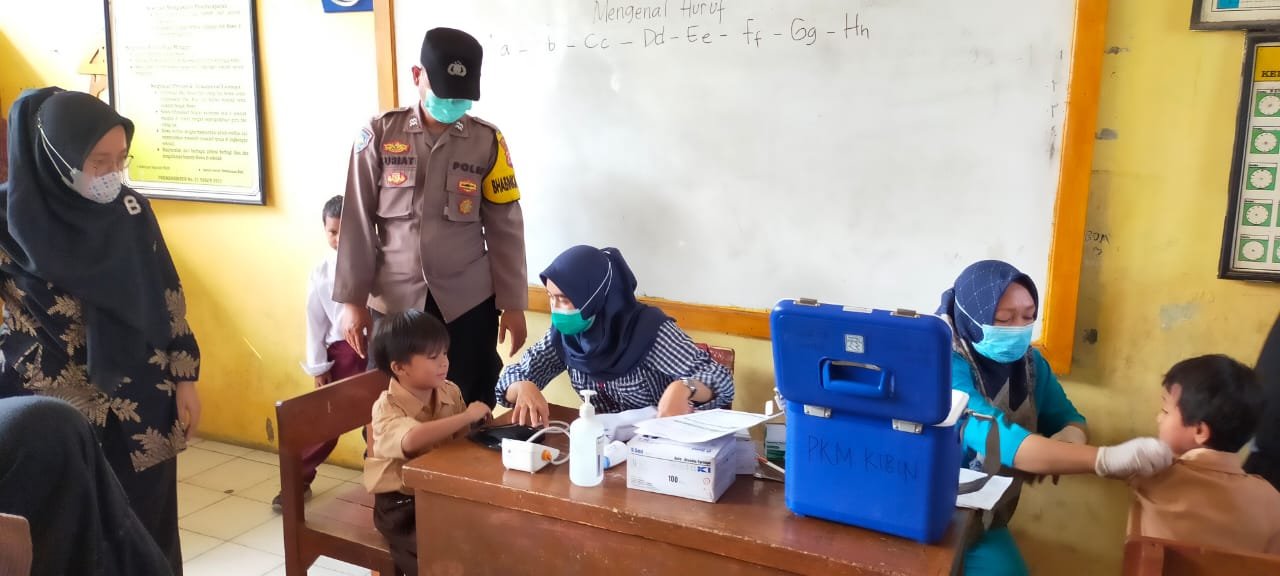 AKP Zainudin Kanit Samapta Polsek Cikande bersama Bhabinkamtibmas saat melaksanaan monitoring mengatakan, ia melakukan pemantauan langsung proses Vaksinasi bagi anak usia 6 sampai 11 tahun, yang dilaksanakn oleh Tenaga Kesehatan (Nakes) Puskesmas Kibin.