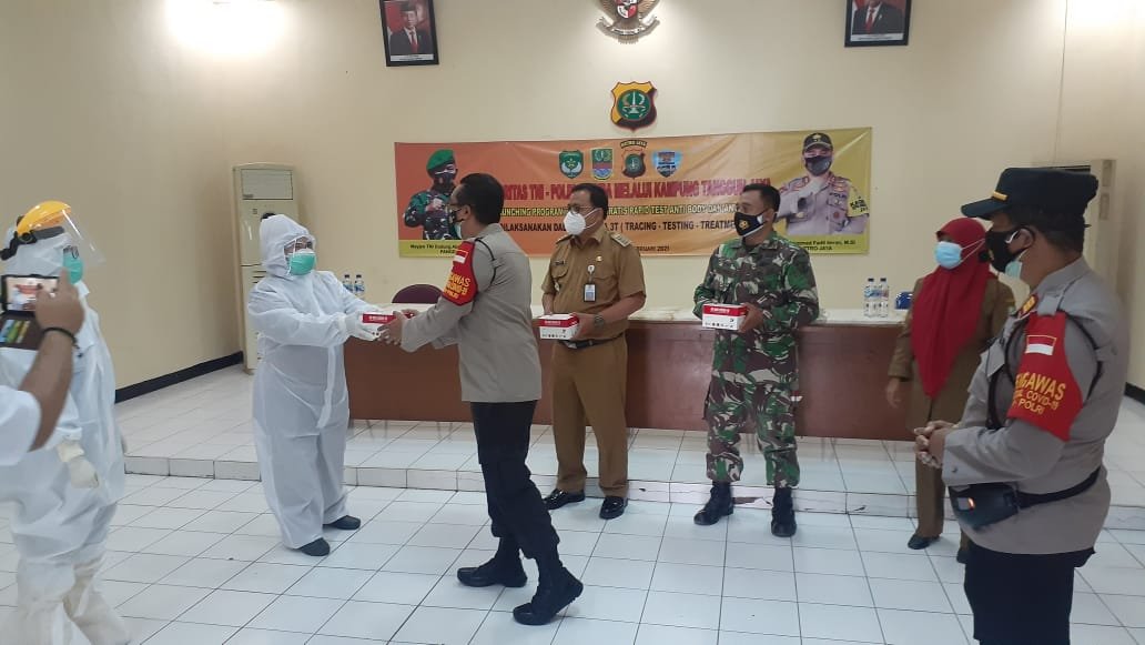 Bertempat di Aula Mapolsek Cikarang Barat, Kelurahan Telaga Asih Kecamatan Cikarang barat Kabupaten Giat Launching Program Pelayanan Gratis Rapid Test Anti Body dan Antigen Kampung Tangguh Jaya di buka langsung Kapolsek Cikarang barat Kompol Akta Wijaya di dampingi Kanit binmas AKP Sugeng Haryanto dan jajaran binmaspol Polsek Cikarang barat. senin (1/2/2021).