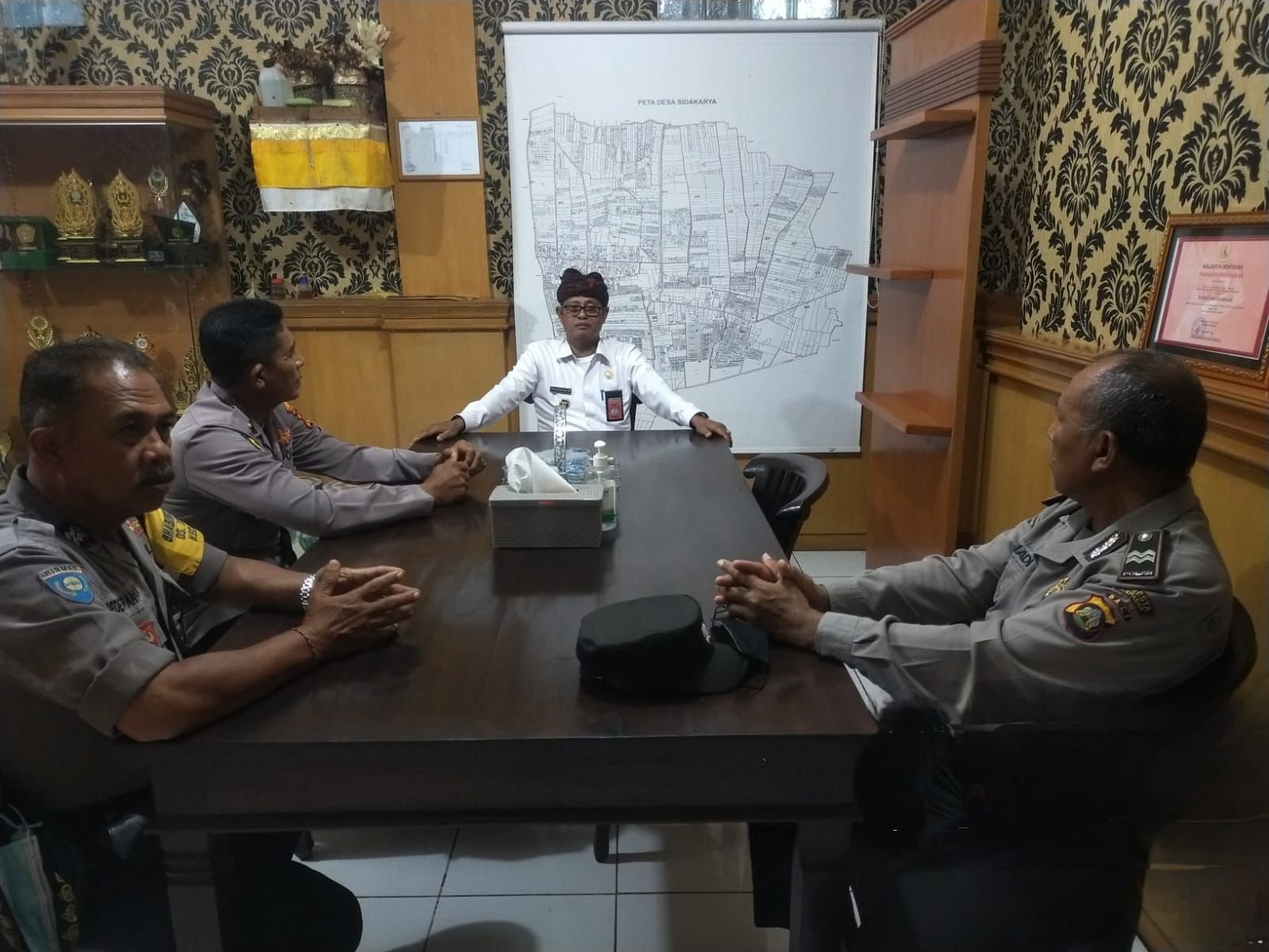 Kanit Binmas Iptu Anak Agung Ketut Sumiarta didampingi Panit 2 Binmas dan Bhabinkamtibmas Desa Sidakarya melaksanakan sambang dan kunjungan terhadap Perbekel Desa Sidakarya I Wayan Madrayasa , S.H. bertempat dikantor Desa Sidakarya, Jalan Raya Sidakarya No. 191, Denpasar Selatan. Kamis, (11-8-2022) siang.