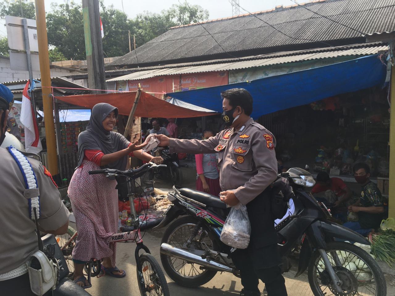 “bersama dengan petugas Polsek muara gembong di bantu petugas Koramil membagikan makser kepada para pedagang dan pembeli di pasar mingguan yang memang ramai setiap minggunya” ujar Kapolsek muara gembong AKP Saipul Anwar.