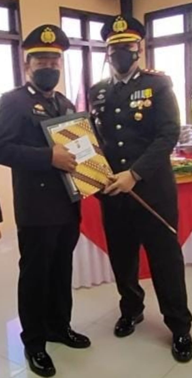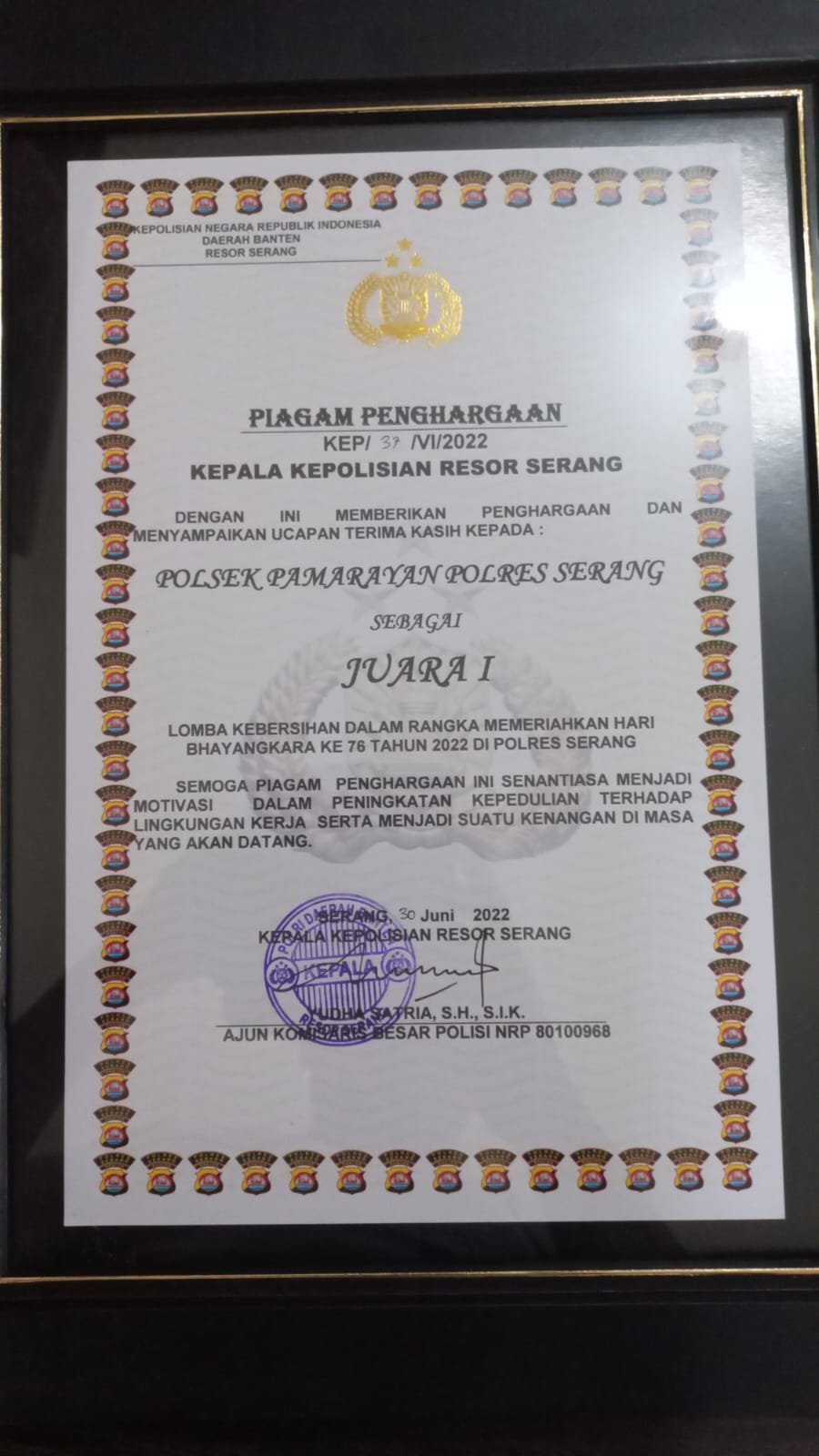 Piagam penghargaan diberikan mapolsek Pamarayan dalam lomba kebersihan.