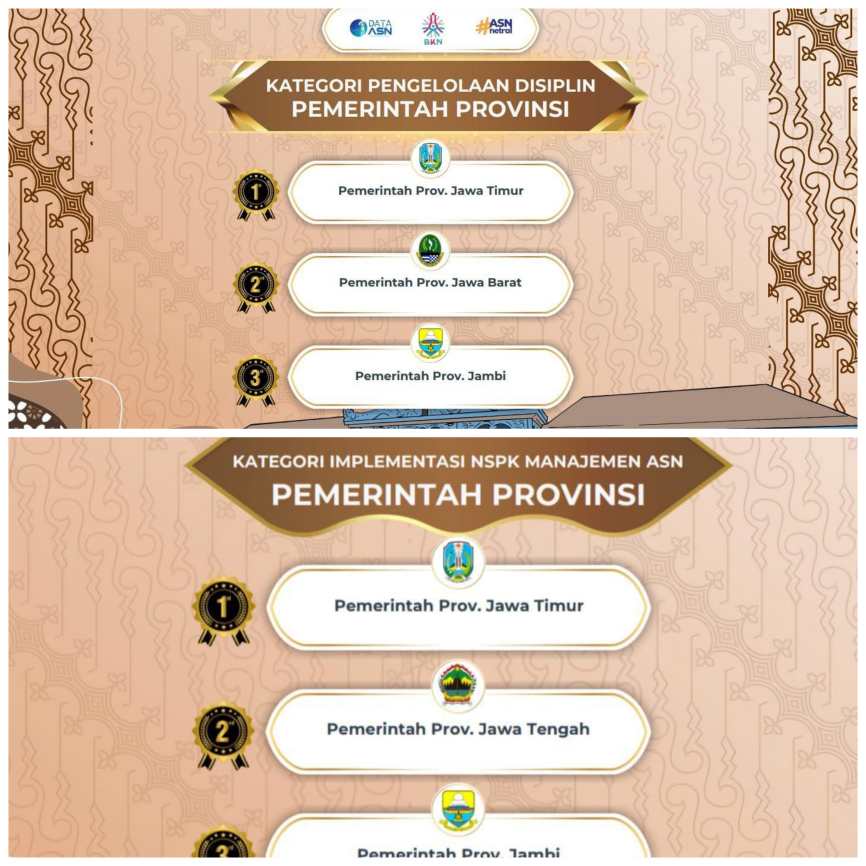 NASIONALXPOS.CO.ID, JAMBI – Disiplin dan Budaya Kerja terus Ditingkatkan Jambi, Pada 13 November 2024 lalu Pemerintah Provinsi Jambi berhasil meraih peringkat 3 nasional Penghargaan Anugerah Manajemen ASN 2024 pada 2 (dua) kategori, yaitu: 1. Pengelolaan Disiplin dan 2. Norma, Standar, Prosedur, dan Kriteria (NSPK) Manajemen ASN Pemerintah Provinsi. Penganugerahan Penghargaan ini diselenggarakan oleh Badan Kepegawaian Negara (BKN) di Solo, Jawa Tengah, beberapa waktu lalu (Rabu,13/11/2024).