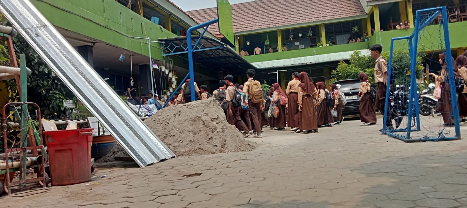 Berdasarkan pantauan di lokasi pada Jumat (27/9/2024) nampak sisa-sisa pembongkaran seperti besi-besi cor, plat gelombang yang terbuat dari bahan galvanis yang digunakan untuk membungkus material cor pada lantai atau dak beton dibiarkan tergeletak di lokasi yang berdekatan dengan lorong yang menjadi satu satunya akses keluar masuk siswa dan seluruh warga sekolah.