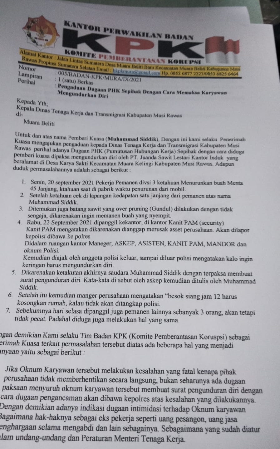 NASIONALXPOS.CO.ID, MUSI RAWAS – Terkait adanya dugaan intimidasi dari Pimpinan Perusahaan PT. Djuanda Sawit Lestari atas pengunduran diri M. Siddik. Tim Badan Komite Pemberantasan Korupsi (KPK) Perwakilan Kabupaten Musi Rawas sebagai Penerima Kuasa telah melaporkan permasalahan ini Kepada Dinas Tenaga Kerja dan Transmigrasi Kabupaten Musi Rawas. (28/9/2021)