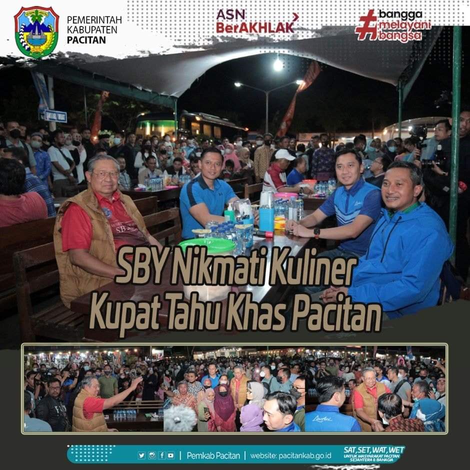 PACITAN, NASIONALXPOS.CO.ID – Menikmati kuliner khas menjadi salah satu agenda Presiden RI Ke-6 Susilo Bambang Yudhoyono (SBY) saat pulang kampung. Menu kesukaannya adalah Kupat Tahu. Ia menikmati penganan itu langsung di Sentra Kuliner Pasar Minulyo di Jalan Gatot Subroto, Pacitan.