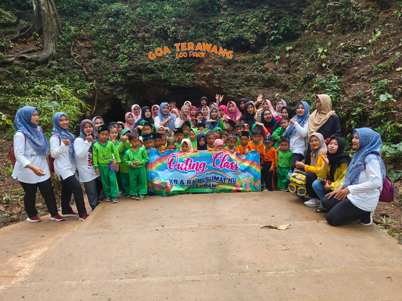 Puluhan Anak KB dan RA Muslimat NU Dologan Wisata Edukatif ke Goa Terawang