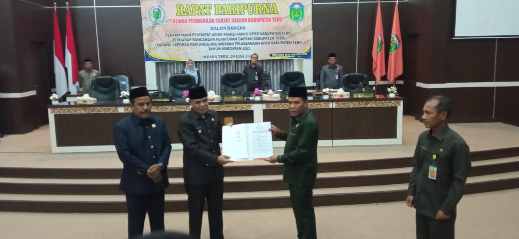 Pj. Bupati Tebo Aspan dalam sambutannya, mengucapkan terimakasih dan penghargaan kepada Dewan yang telah membahas Ranperda pertanggungjawaban APBD TA 2021 menjadi Perda.