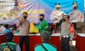 “hari ini kami dari satlantas polres metro Bekasi menargetkan 100 ojek online untuk di lakukan vaksinasi, selain itu ratusan Ojol tersebut usai di vaksin, langsung mendapatkan masker, sembako berisikan Beras dan bahan pokok lainnya” tandes AKBP Argo Wiyono.