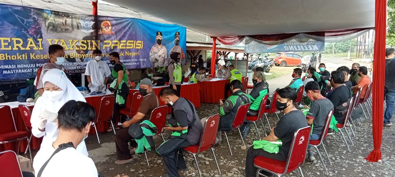 Dengan melakukannya vaksinasi di halaman kantor laka lantas polres metro Bekasi yang berada di jalan raya infeksi kali malang, kecamatan Cikarang Utara, Kabupaten Bekasi,  ratusan ojek online dengan mengedepankan protokol kesehatan ketat, mengantri untuk di lakukan vaksinasi oleh petugas kesehatan di bantu tim relawan di tempat tersebut.