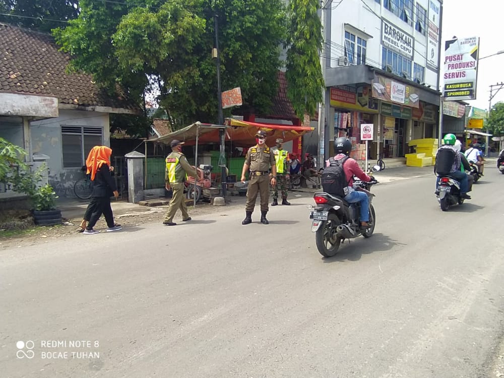 Nampak petugas gabungan dari Satpol PP Cepu, Koramil dan Polsek Cepu melakukan pemantauan kegiatan warga di sekitar taman seribu lampu, dan jika ditemukan pelanggaran protokol kesehatan maka akan dikenakan sanksi sesuai dengan aturan yang ada.